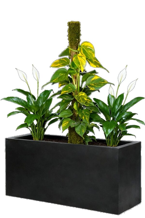 Bac végétal d’intérieur “Jort” en poterie noire, de 30 cm de large, 80 cm de long et 40 cm de haut, rempli d’un substrat adapté aux plantes d’intérieur et une couche absorbante en billes de céramique, assurant une bonne gestion de l’eau et un drainage optimal.. Il accueille un magnifique pothos (Scindapsus) guidé sur un tuteur en coco de 110 cm de hauteur, offrant un effet vertical luxuriant et graphique, ainsi que deux spathiphyllums mesurant chacun 70 cm, apportant douceur et élégance avec leurs feuilles brillantes et leurs fleurs blanches délicates. L’ensemble crée un équilibre harmonieux entre hauteur et densité végétale, ajoutant une touche naturelle, moderne et apaisante à tout intérieur, salon ou bureau.