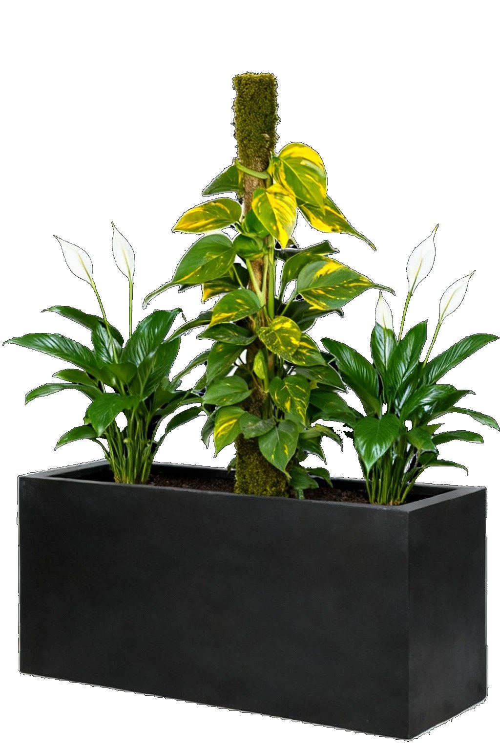 Bac végétal d’intérieur “Jort” en poterie noire, de 30 cm de large, 80 cm de long et 40 cm de haut, rempli d’un substrat adapté aux plantes d’intérieur. Il accueille un magnifique pothos (Scindapsus) guidé sur un tuteur en coco de 110 cm de hauteur, offrant un effet vertical luxuriant et graphique, ainsi que deux spathiphyllums mesurant chacun 70 cm, apportant douceur et élégance avec leurs feuilles brillantes et leurs fleurs blanches délicates. L’ensemble crée un équilibre harmonieux entre hauteur et densité végétale, ajoutant une touche naturelle, moderne et apaisante à tout intérieur, salon ou bureau.