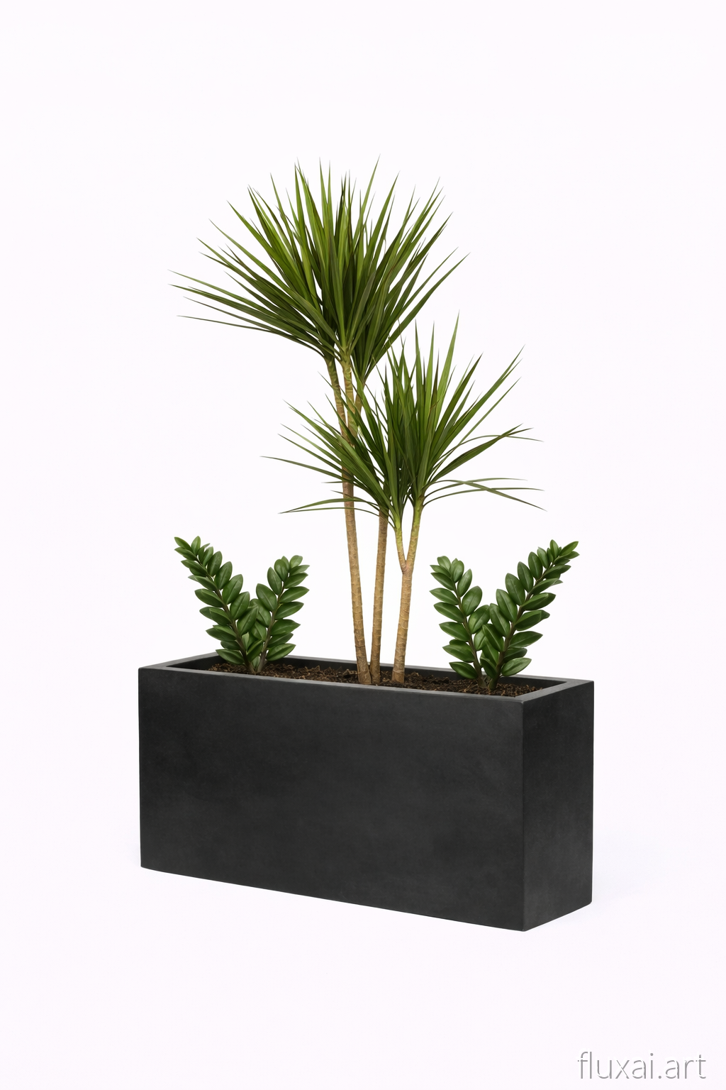 Bac végétal d’intérieur “Jort” en poterie noire, aux dimensions généreuses de 30 cm de large, 80 cm de long et 40 cm de haut. Il est rempli d’un substrat spécialement conçu pour les plantes d’intérieur, offrant un environnement idéal pour la croissance et la santé des végétaux. Ce bac accueille un majestueux dragonnier de Madagascar qui apporte hauteur et élégance, accompagné de deux zamioculcas aux feuilles brillantes et graphiques. L’ensemble crée un équilibre harmonieux entre verticalité et densité végétale, ajoutant une touche naturelle et contemporaine à tout intérieur, qu’il soit moderne ou classique, salon, bureau ou espace de détente.