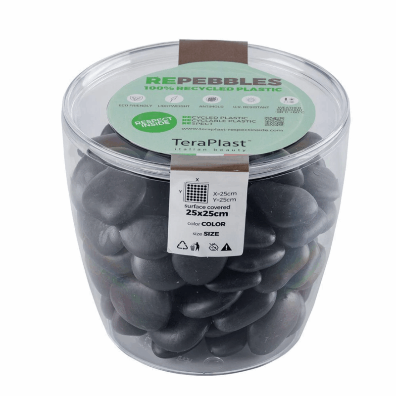 Les galets décoratifs sont fabriqués en plastique recyclé et recyclable à 100%. Ils sont livrés dans un contenant transparent dim. H. 12.5 x 13 Ø pouvant servir de cache-pot.