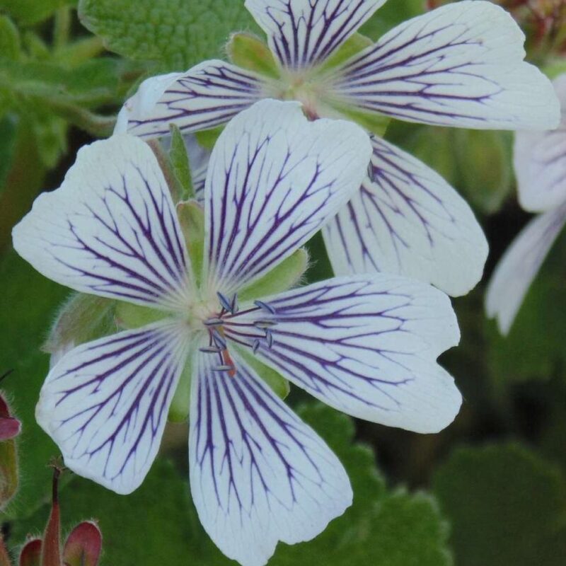 Ce géranium forme de petites touffes persistantes dont le feuillage vert grisâtre est gaufré et duveteux. Surmonté d’une jolie floraison blanche veinée de rose, il se plaira dans les endroit les plus sec du jardin.