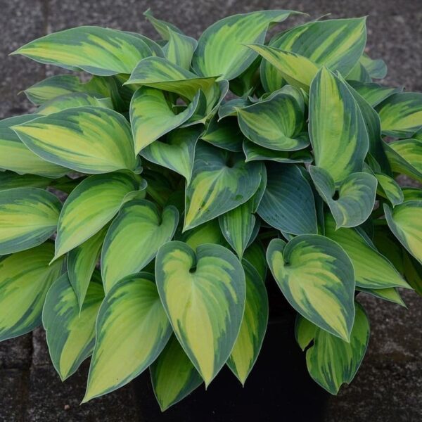 Hosta ‘June’ est une vivace très appréciée pour son feuillage lumineux et changeant. Ses feuilles épaisses présentent un centre jaune doré à vert chartreuse entouré d’une large bordure bleu-vert, offrant un contraste élégant qui évolue au fil de la saison.
