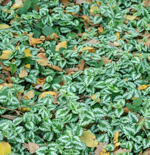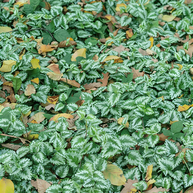Les fleurs jaunes émergent des feuilles argentées marbrées. Cette espèce forme de longues pousses qui recouvrent rapidement le sol même en situation fortement ombragée.