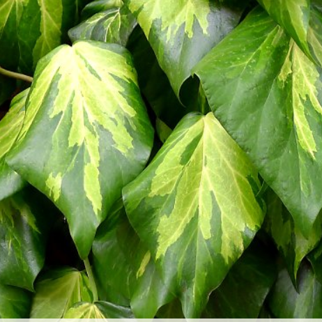 Ce lierre vigoureux possède de grandes feuilles luisantes irrégulièrement panachées de jaune en leur centre.