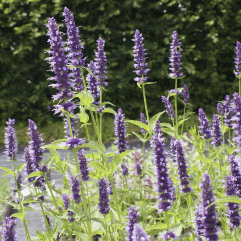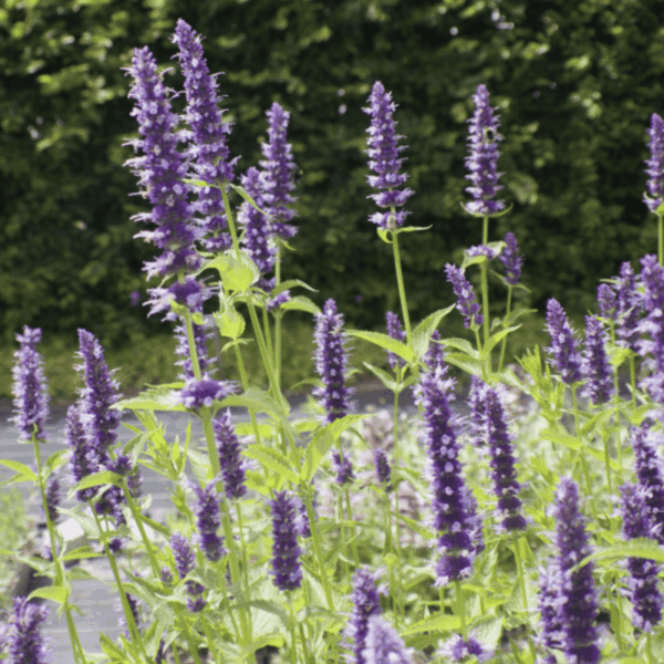 Agastache rugosa ‘Black Adder’ est une vivace aromatique très mellifère appréciée pour ses épis floraux verticaux violet foncé presque noirs qui attirent fortement abeilles et papillons. Son feuillage dégage un parfum anisé lorsqu’on le froisse. Elle forme une touffe légère et florifère idéale pour massifs ensoleillés, jardins naturels et secs, et apporte une longue floraison estivale.