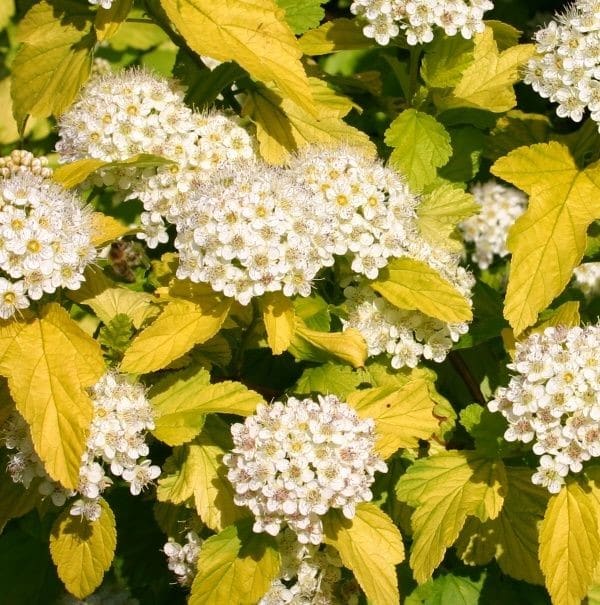 Cet arbuste au port compact est très lumineux car il possède des feuilles lobées de belle couleur jaune dorée du printemps à l’automne. En mai et juin il produit de jolies fleurs blanches. Très rustique, il est facile à cultiver dans la plupart des sols.