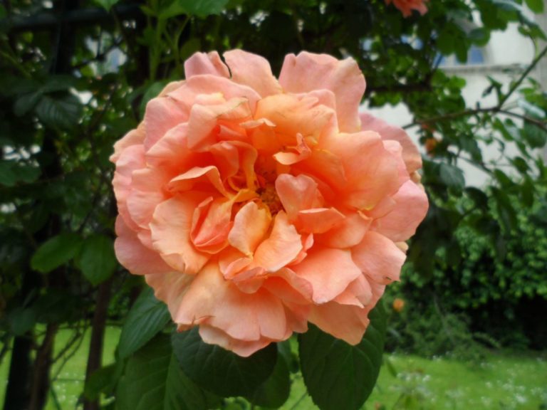 Végétation moyenne, floraisons abondantes et feuillage lustré. Charme ancien pour cette grande fleur aux pétales froissées, abricot clair. Parfumée.