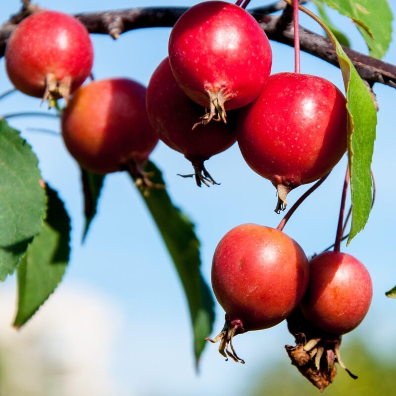 Cette variété de pommier ornemental est intéressante par son port érigé, permettant ainsi une utilisation dans de petits espaces. La floraison rose sera suivie de petits fruits rouges persistant longtemps dans l’hiver.